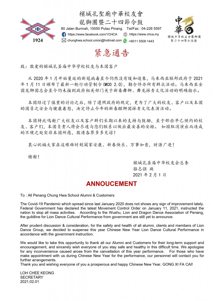 After prudent discussion & consideration, for the safety and health of all alumni, clients and members of Lion Dance Group, we decided to suspense this year Chinese New Year Lion Dance Cultural Performance in accordance with the government instruction.
