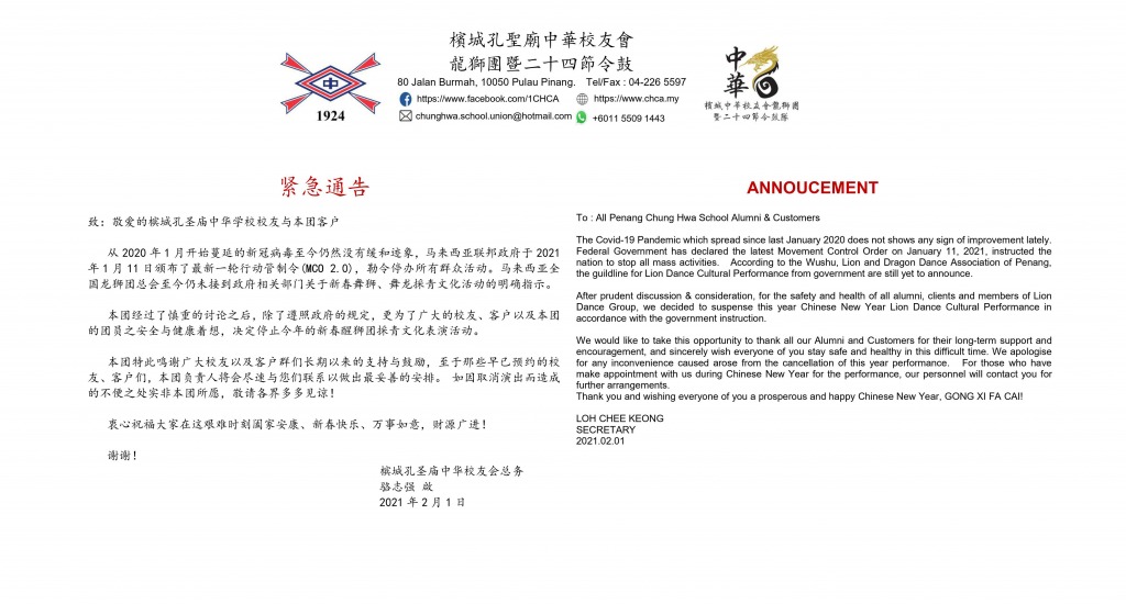 本团经过了慎重的讨论之后,除了遵照政府的规定,更为了广大的校友、客户以及本团的团员之安全与健康着想,决定停止今年的新春醒狮团採青文化表演活动。